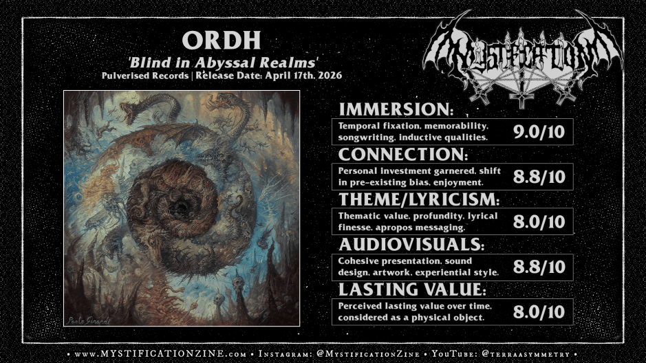 Presented in marvelously chasmic horizonless array and carefully bent, curved into death’s spiral a host of monstrosities collude as this beauteous and beastly debut full-length album from Brattleboro, Vermont-based death metal quartet ORDH introduces their warped idyll in glorious descent. A hypnotic event given a reasonably consistent guide-hand to ensure passage ‘Blind in Abyssal Realms‘ may ultimately read as a vortex of myriad thoughts in succession but one which does well to lend shape and direction to each scene depicted, implying a progression which holds up within reverent observance. As a debut album from an unknown progressive death metal band it is well above-average in both authorship and expression where niche tastes and auld tendencies make for an engrossing, addictive saunter into the abysm.