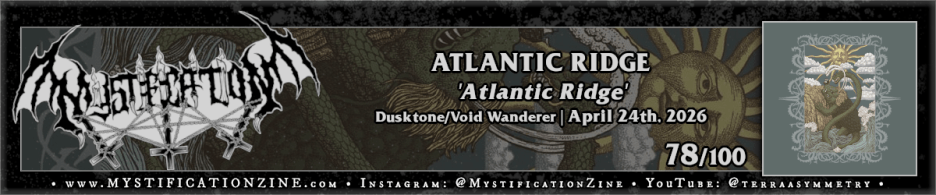 ATLANTIC RIDGE is a side-project from G.E.F. (Thecodontion, et al.) and J.G.P. (Bedsore) combining extreme doom metal and atmospheric/post-black metal ideas which the duo have been working on since roughly 2019. The general concept of the band and this self-titled debut album, ‘Atlantic Ridge‘, revolves around exploration of unknown reaches where their imagination has been stoked by unique geologic features typically named/referenced in their song titles. The style of the band is uniquely cast between the rumbling, doomed step of The Ruins of Beverast and the post-metal affect of bands like Altar of Plagues which is made all the more interesting via frequent transition into funeral doom metal. The programmed drums are a bit flat and the overall render is muddy but this lends the whole experience a satisfyingly obscure, affected tonality which only helps extend their majestic deep underwater station. The ~13 minute closer is probably the piece to sell the whole idea but this one is best enjoyed in one continuous listen per is intentionally immersive design.