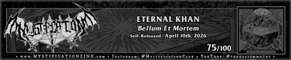 Providence, Rhode Island-based trio ETERNAL KHAN return for a third full-length album a full decade beyond the last concocting a louder, more directly shot effort this time around. For ‘Bellum et Mortem‘ they’re once again repping a style of shouted-out thrashing black/doom metal which exists in similar realm with Celtic Frost inspired groups of yore. Their work here touches upon brutish heavy metal command and/or unhinged warrior sludge depending on the piece but generally features black metal inspired guitar work throughout. Though I appreciate the cranked-to-ten approach overall the vocals here are less than dynamic in delivery and this takes away from points of slower tempo movement (re: “Remember You Are Mortal”) in particular, occasionally trampling upon the sombre and heroic striding of their black metal riffcraft. To be fair “Hypnos” pulls back a bit later on so they can ease their barking when called for but this one is a barker in any case. “Far From This Dismal Shore” is probably my favorite piece here with regard for their black metal-sided features though I’d enjoyed the Dayglo Abortions-esque sneer of closer “Shaken Baby Death Rattle” just as much.