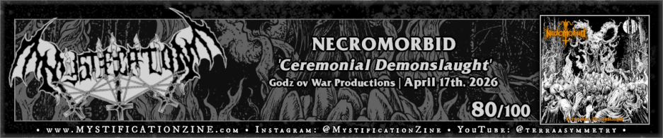 Florence, Italy-based trio NECROMORBID aren’t just another bestial war metal whatever band but rather a thunderous, well-curated black/death metal troupe with a wild-yet-dramatic atmospheric touch to their craft. ‘Ceremonial Demonslaught‘ is their third LP in the span of ten years and despite looking like the usual whip-fest it reeks of adept conjure rather than harried slop. Opener “Perverted Abhorrence Domain” is the piece to make this argument up front but “Evil Angelic Might” (“Inverse Cruxifixation” also) more clearly illustrates their frequent treading into “atmospheric” death metal tribulation and how this lends grotesque tension to their work. It also highlights the production values which are unusually precise, especially the bass guitar tone’s ever present representation, which enforce constant interest rather than chaotic scrambling about. While I don’t know that they’ve brought an all new sound to bestial death metal this record has such a hot-shit, nails heavy sound I’d found myself returning to it way more than expected.