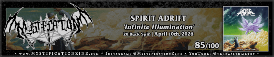 After ten years and now six full-length albums under wing Austin, Texas-based musician Nate Garrett sends his heavy rock inspired doom metal band SPIRIT ADRIFT into the great beyond. Having risen from stonier realms unto slick-as-fuck amalgam of heavy metal, 80’s doom and sludgy hard rock they’ve come back to Earth for a final album after two big ones for Century Media. ‘Infinite Illumination‘ is threaded with traditional doom metal beyond anything they’ve done since 2019’s ‘Divided by Darkness‘ as the Trouble-cribbed main riff from “You Will Never Hold the Key” suggests alongside its transition into late 80’s Candlemass styled movement in the second half. That song, alongside Side B kickoff “Buried in the Shadow of the Cross” (see also: “Where Once There Was an Ocean”), acts as sublime testimony to how effective Garrett can be translating directly from classic source (often 90’s looking back or looking forward) into his own dramatic ouevre. These are some of the best songs from the band for my taste… at least when standing outside the wall-to-wall brilliancies of ‘Curse of Conception‘ (2017). The only song here which doesn’t land for my own taste is the bopping mosh riff pumped “Born in a Bad Way”, sounding like a generic fest band trying to get normies to shake ass. Going out with some of the very best material from the project is an admirable feat, definitely a bittersweet yet respectable exit. If you lost track of the band beyond their earlier duo of 20 Buck Spin releases this one’ll feel like a natural keystone atop ’em both.
