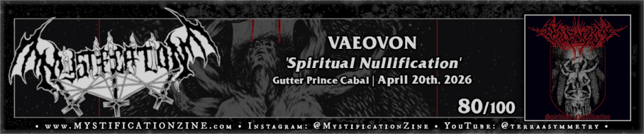 New Zealand-based black metal duo VAEOVON emerge from the darkness red-handed as their bloodier, scurrilous take on blackened death metal arrives fully formed and formidable per this intense debut full-length album. ‘Spiritual Nullification‘ isn’t solely zoned into brutality and doesn’t quite angle itself alongside bestial death or war metal despite carrying that inherent foundation, instead abstracting that intensity into frequent sidebar which allows for ranting and ripping tangent (see: “Plague Reverence”) ad infinitum. What that translates to in plain English is a lot of riffs, a thousand cuts across the face delivered within each of these pieces. The extreme level of right arm stamina expressed here is impressive especially via songs which do not vary at all in tempo (“Death Proclamation”) and burn through four or five minutes of uninterrupted whirring. Their gig isn’t just pure aggression, though, as you’ll find interludium and atmospheric black/death epic (“Shadow Dissolution”) stance in their ouevre which ensure movement even if some techniques do become strained by the endpoint. The whole deal is impressively mayhemic in its needling action yet precise in performance and construction, a wild and rare feat for their lane which radiates with terrifying violence throughout.