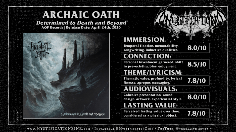Much as it might appear I’ve categorized and blockaded any too-direct praise of Archaic Oath‘s work here I’d found ‘Determined to Death and Beyond‘ brilliantly immersive, rife with neatly flowing and detail-rich rhythmic ideal from the first listen. The experience which radiates off of these folk’s work should be obviate even without their enduring resumes attached as the level of performance and craft here is commendable from any angle. How original their work is is another discussion altogether and would probably miss the intended vision which suggests reviving these principles is their major goal. Their methodology here is entirely appropriate for a debut album which is strongly curated as well as clear in purpose, my own concern is how much their own interstitial development will stand out in the long-run beyond those ear gripping references. A high recommendation.