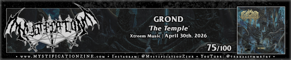 Moscow, Russia-based death metal quintet GROND bring a loud and somewhat chaotic big-grooving approach to this third album. Rooted in ‘old school’ Eldritch death interest but lacking a compelling grasp of the riff for my own taste ‘The Temple‘ generally focuses on lead guitar interest in order to differentiate each song. That is to say that they’re prone to distract with shredding and divebombing rather than a melodious one and most of these songs simply lumber within mid-paced riffing that is indiscriminate from my point of view, larger gestures you’d find on a Hail of Bullets album (see: “Dreadnought”). Vocals are inhuman and almost function as an atmospheric element within the band’s cranked approach but everything is so damned cranked to ten that their wall of sound obliterates much of the nuance available. There are a few exceptions such as the mid-paced and doomed title track, “The Temple” (see also: closer “Dark Solitude of the Sea” intro), which brings in keys for its middle section. The second half/end of the album is easily its better half for my own taste, so if you’re not sure on this one off the bat hang out ’til the end to see how it develops.
