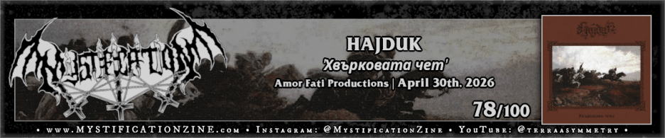 For what it is worth this debut album from Bulgarian black metal artist HAJDUK was the first record of the lot reviewed this week I’d cranked the volume up to an unhealthy level as its roughly hissing guitar sound and deeper-set melodic thread inspired. Inspiration is a fitting observation as the title ‘Хвърковата чета‘ refers to the Flying Cavalry, a troupe and movement from Bulgarian revolutionary apostle Georgi Benkovski which’d inspired the populace (and foreigners) against the Ottoman empire. Though I’m not sure how much of the figures life they detail here they’ve been inspired by classical poetry for the lyrics and Bulgarian folk music for their melodies, ensuring they’ve escaped at least some of the common tropes of raw melodic black metal ideals today. Fans of chivalric melodic black metal from France and Poland should appreciate the approach here which is tuneful and dramatic at once. Certain songs have their cloying moments (re: parts of “Ударите”) but I figure if you can hang with a Drudkh album you’ll still appreciate this. Sublimely immersive work.