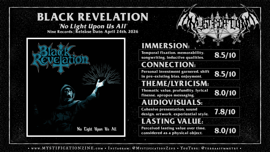 The seeds of our ruination have been planted for the sake of cruelest self-destructive humours, a greed for power and hatred rising in the blood, which spreads across the senses in tar-like suffocating mass despair. For their sophomore full-length album German doom metal quartet BLACK REVELATION raise the obsidian mirror of fate upon the doom-afflicted masses one towering piece after another and in the process reveal the face of death as the great equalizer. A work of cursed catharsis purporting universal damnation within intimate yet exaggerative narrative ‘No Light Upon Us All‘ crosses many generational lines in sourcing its impressive, now doubly refined classics-minded craft.
