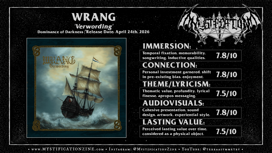 ‘Verwording‘ expresses enough vibrant character throughout its ~39 minute run to entertain general black metal audiences via conviction and melodious uprise. No doubt this is Wrang‘s best-yet effort if only for the sake of better communicating their moderately complex sonic personality and path in a strident and I’d say not-so edgy manner. Though I’m not sure the signature of the band is any easier to pinpoint within this work it is yet a tunefully bounding work which rallies through each piece with an above-average sense of wrathful narrative underpinning its otherwise guitar driven pulse. A moderately high recommendation.