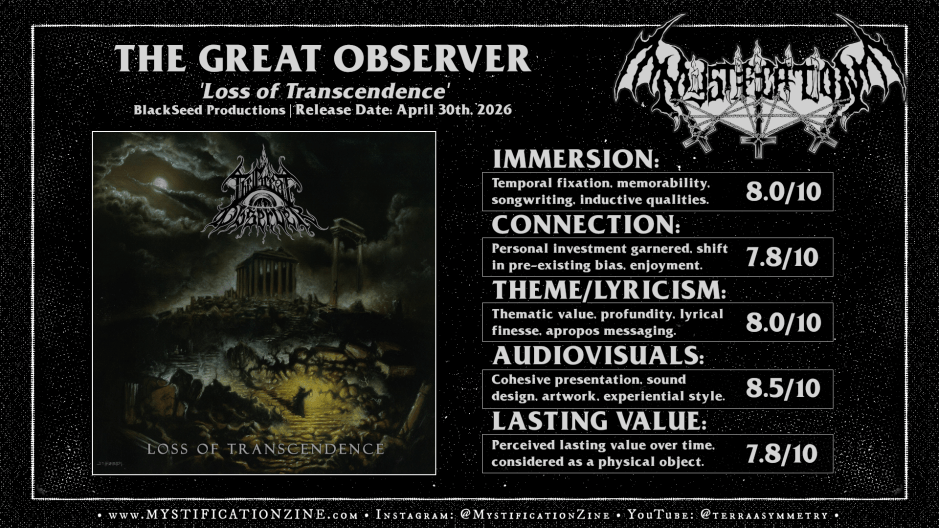 ‘Loss of Transcendence‘ is a well-concieved and brilliantly stylized release which offers numerous skull ringing anthemic moments throughout its bulldozing heavy metal stride. The shouted, barked and riff-forward ride through The Great Observer‘s work arrives in admirable tradition as they endeavor to amplify the effect of early extreme metal unto greater forum, songs to rally dissenters as they go on shaking their fists throughout the hall. Otherwise I’ll emphasize this album’s likely appeal to fans of 80’s heavy metal as well as early manifestations of extreme metal still girded by thrash metal dynamism. A high recommendation.